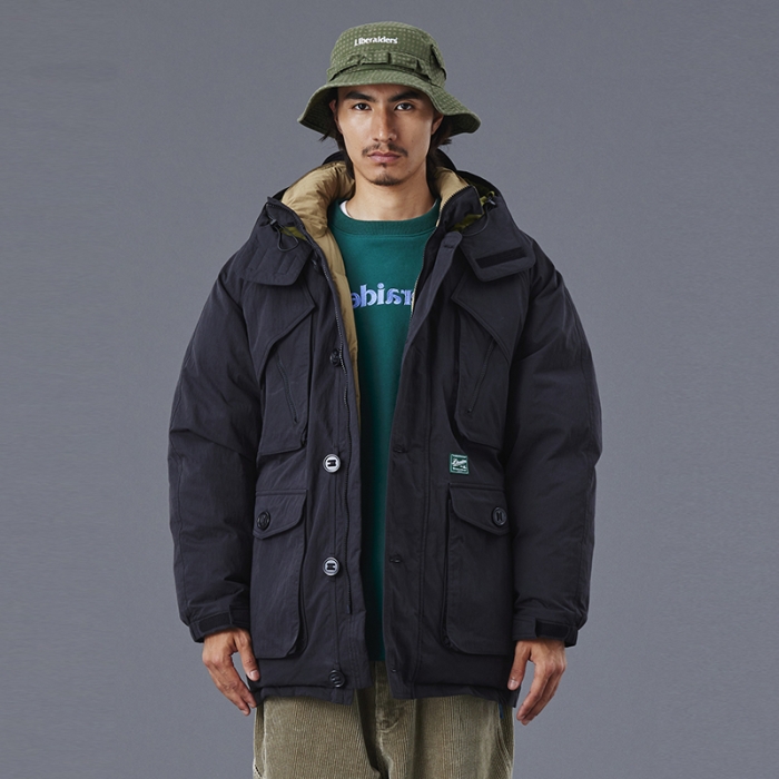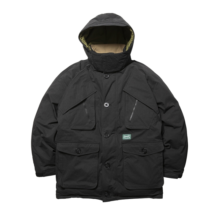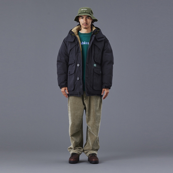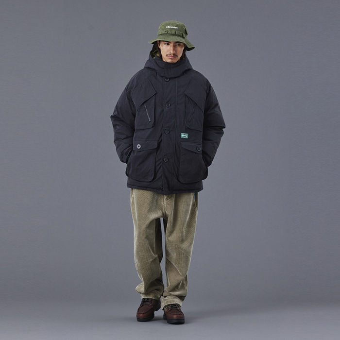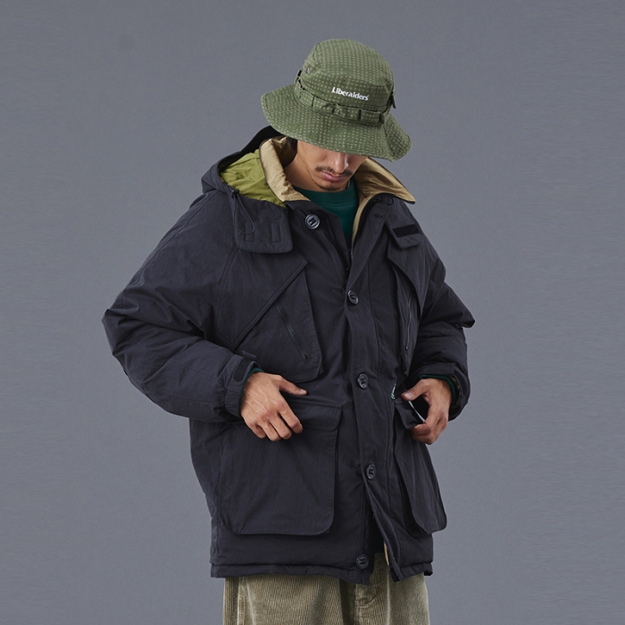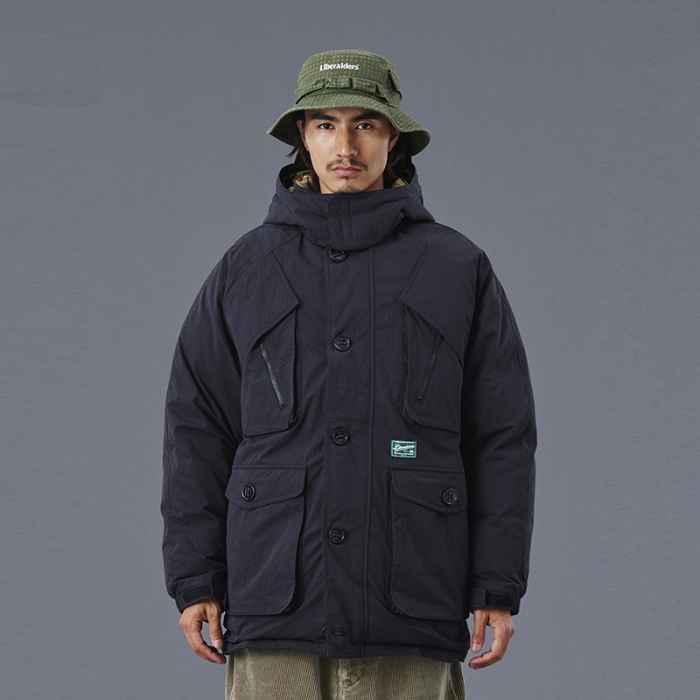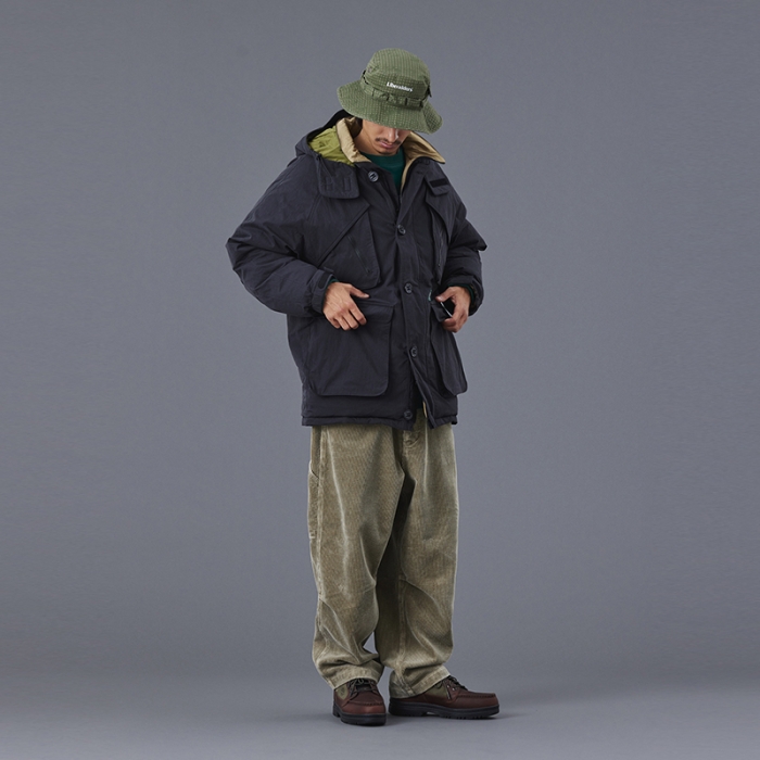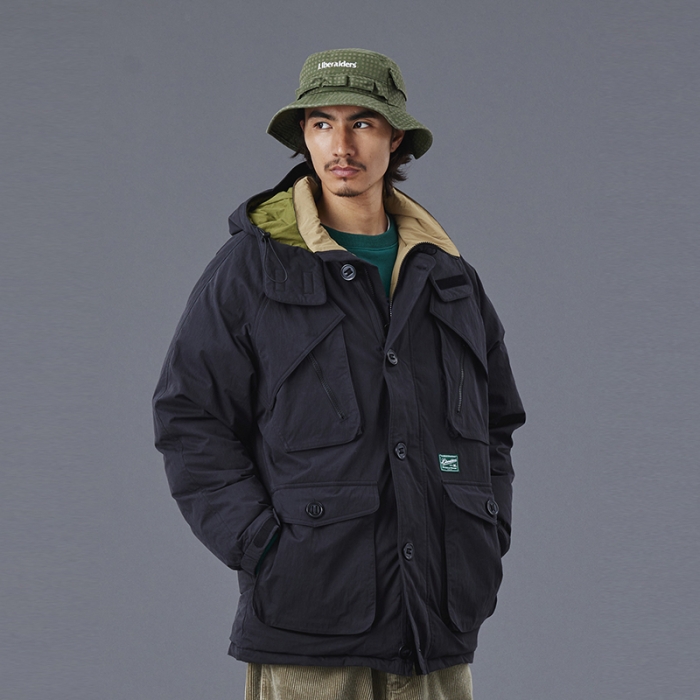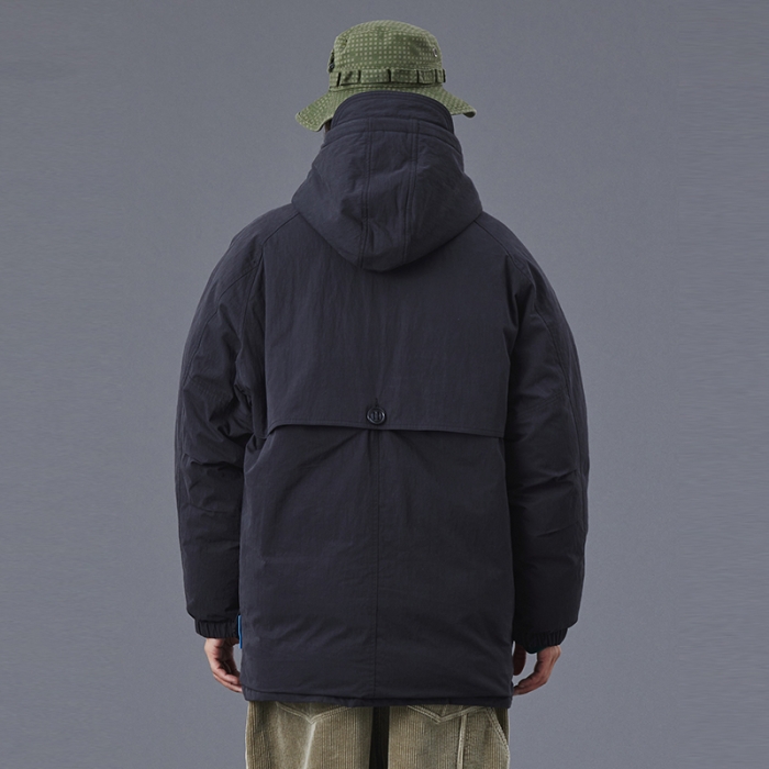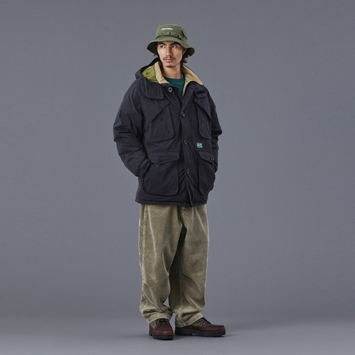 フードは脱着式の為、着脱による変化を楽しめる一着、大型ポケットを配置し、収容力にも優れています。