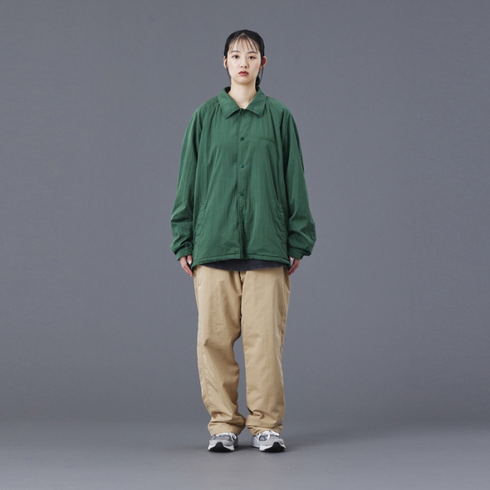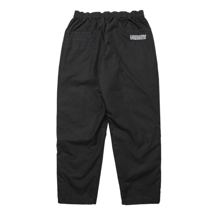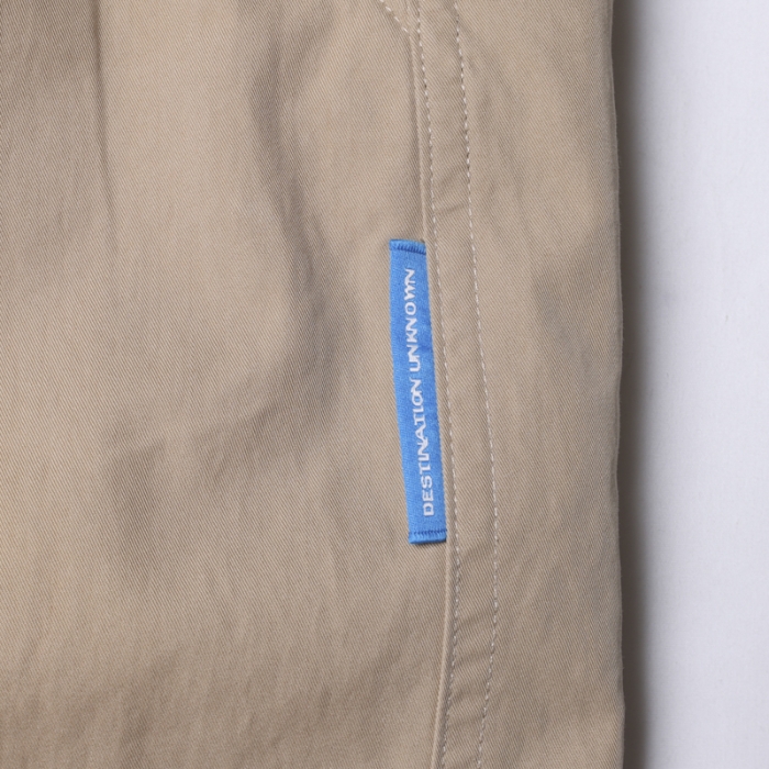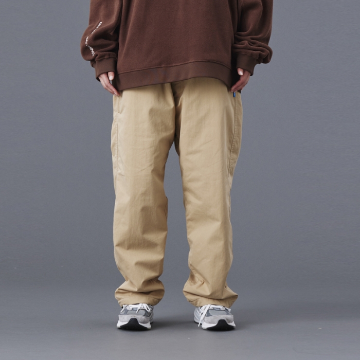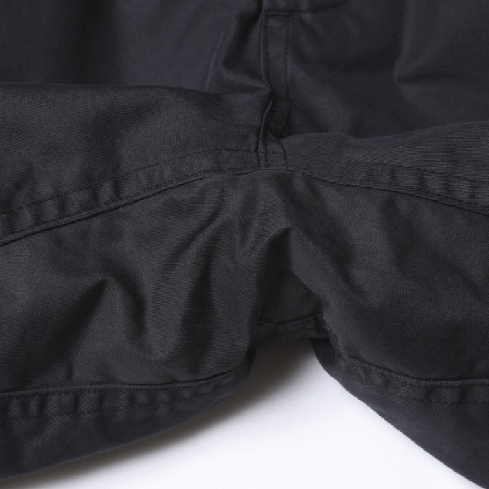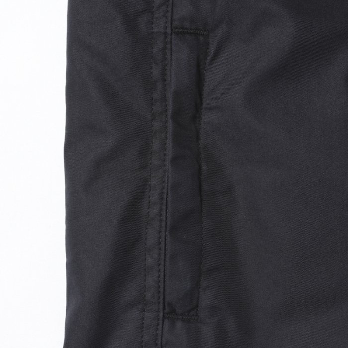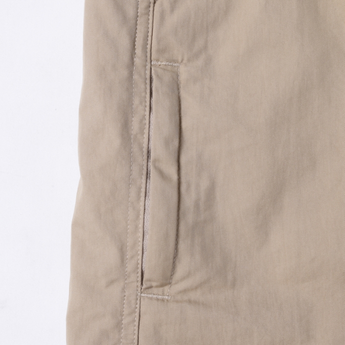 強度のあるコットンナイロンのツイルを使用し、薄い中綿を入れたチノパン。