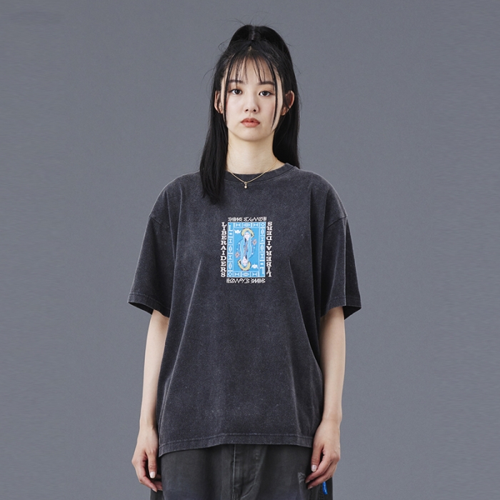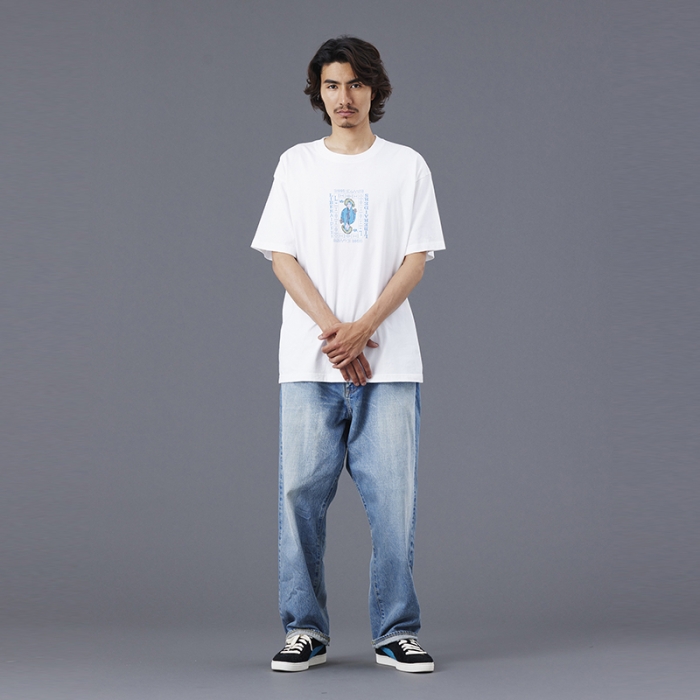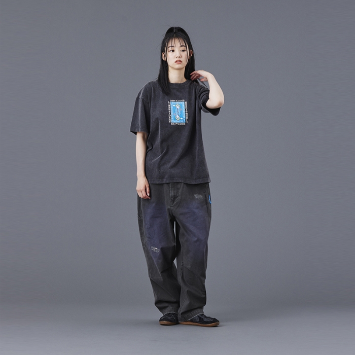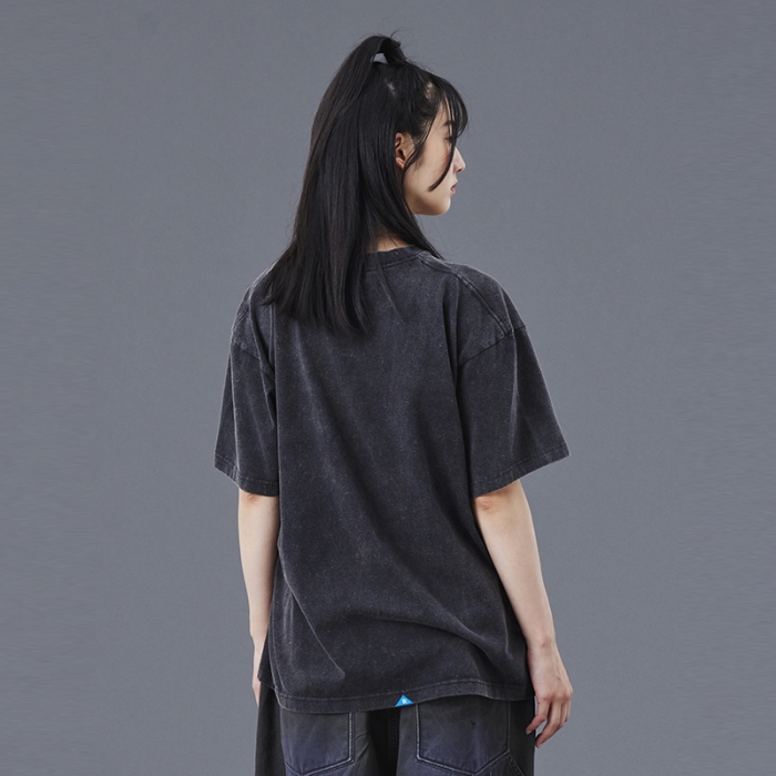 Tシャツには全体を起毛させ、色を退色させるパウダーフロスト加工を施しており、肌触りが良くヴィンテージライクな仕上がりになっています。