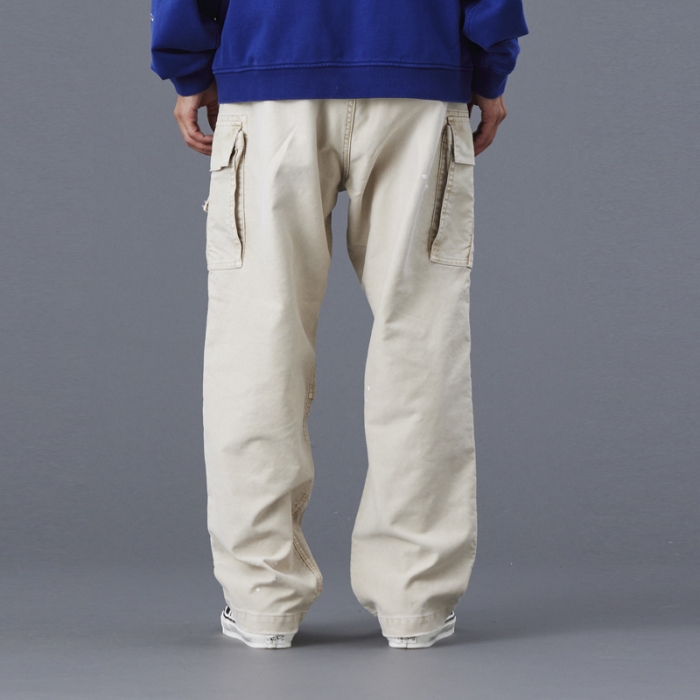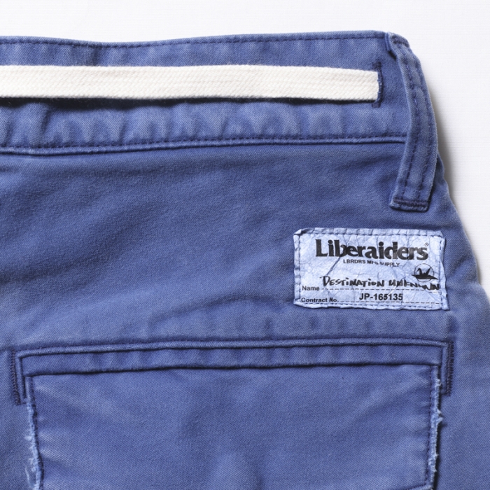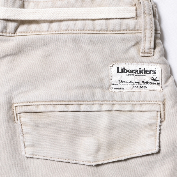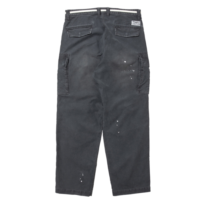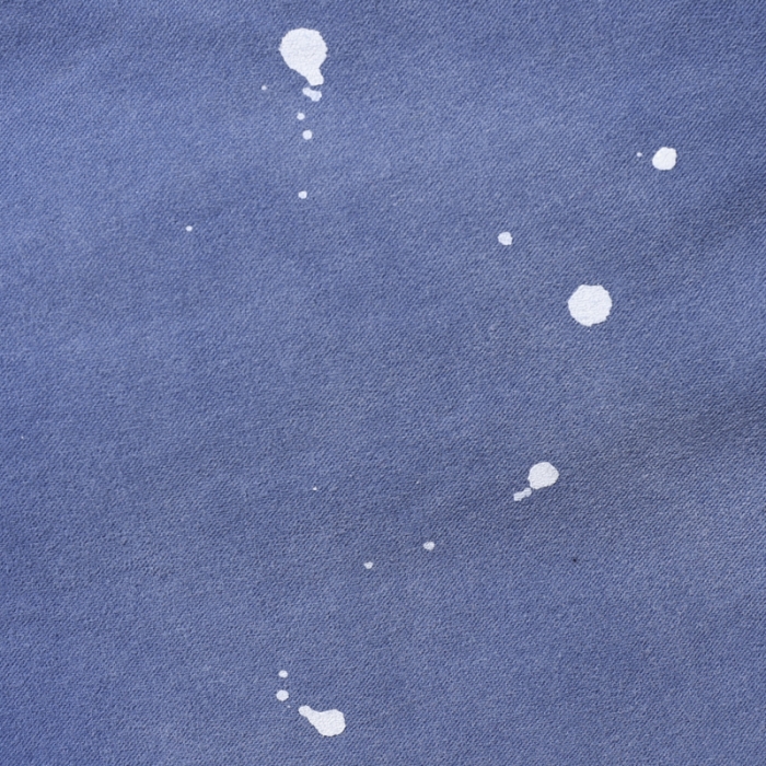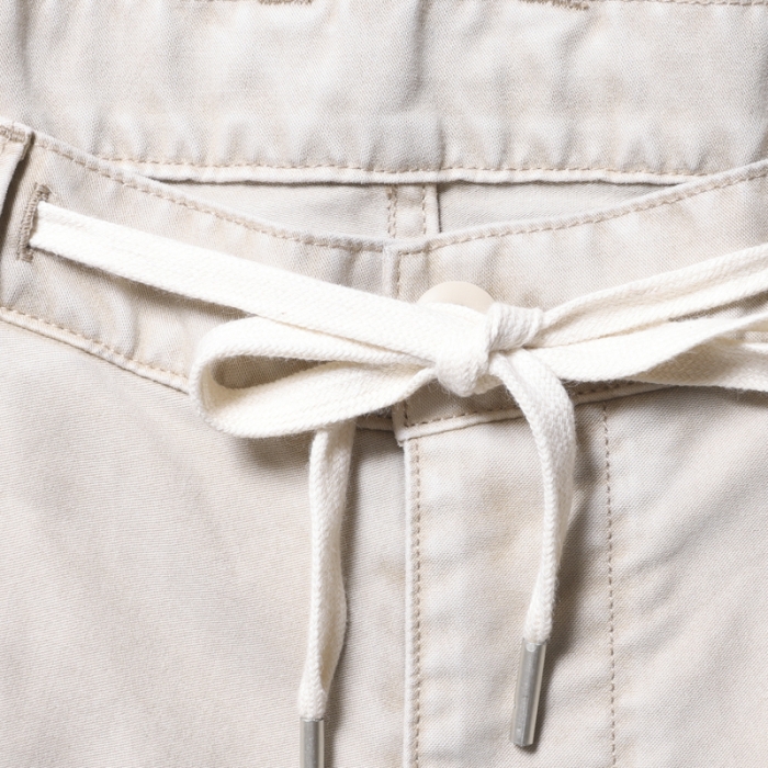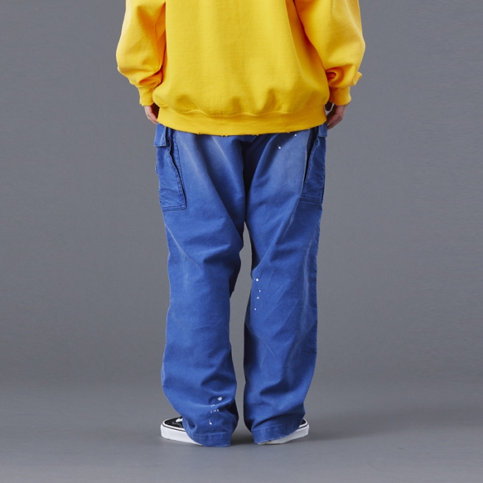 ウェストにはシューレースベルトを配置、全体的に色落ち加工を施し、ペンキ加工でメリハリをつけています。