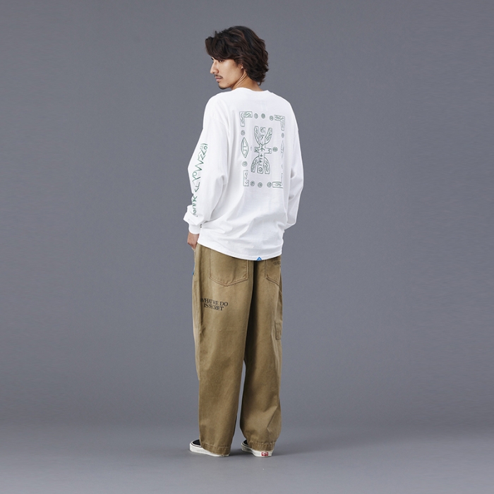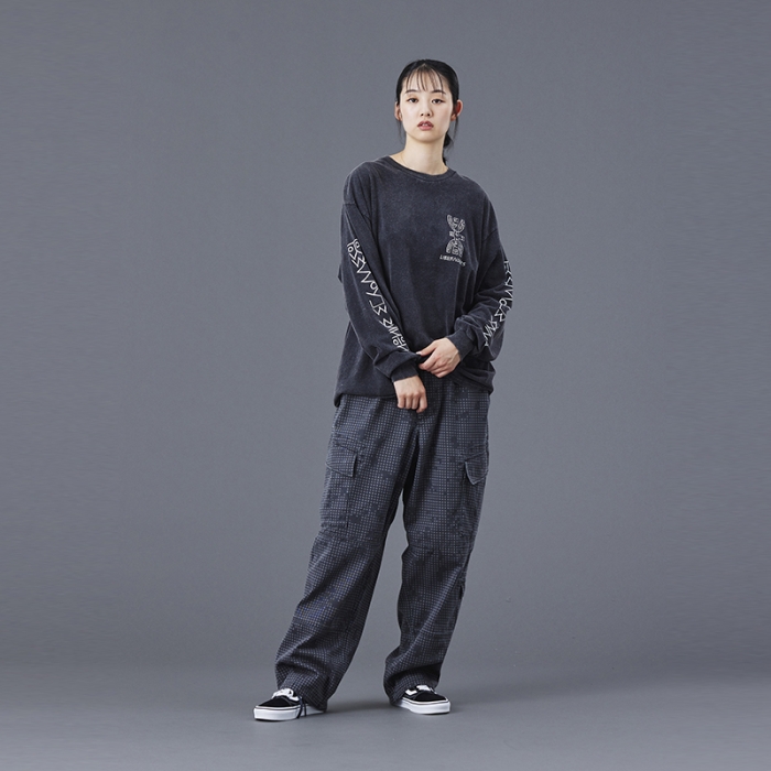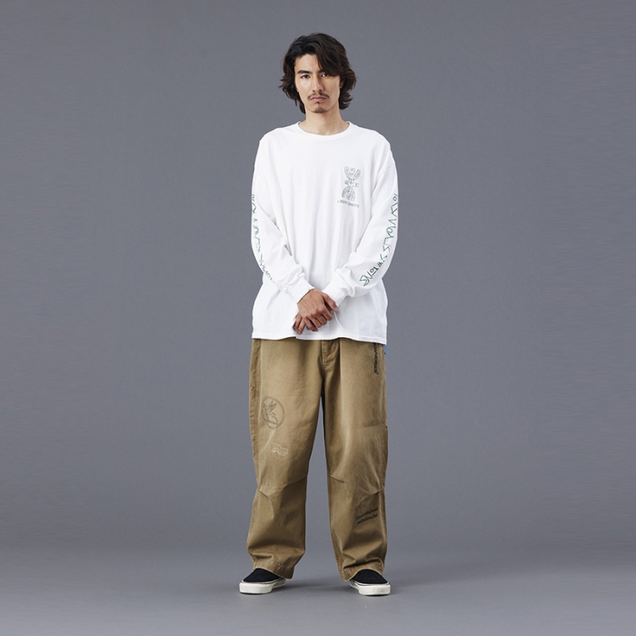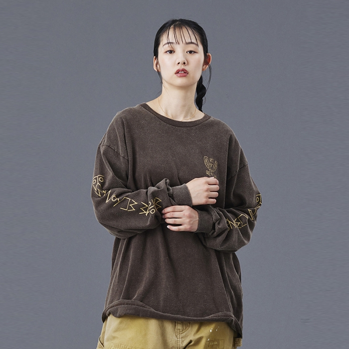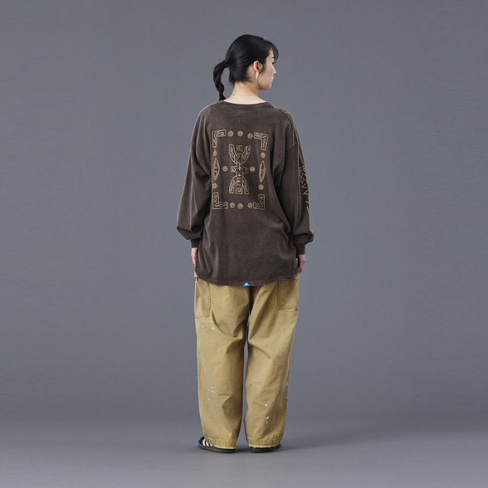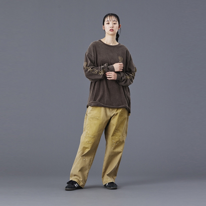 Tシャツには全体を起毛させ、色を退色させるパウダーフロスト加工を施しており、肌触りが良くヴィンテージライクな仕上がりになっています。